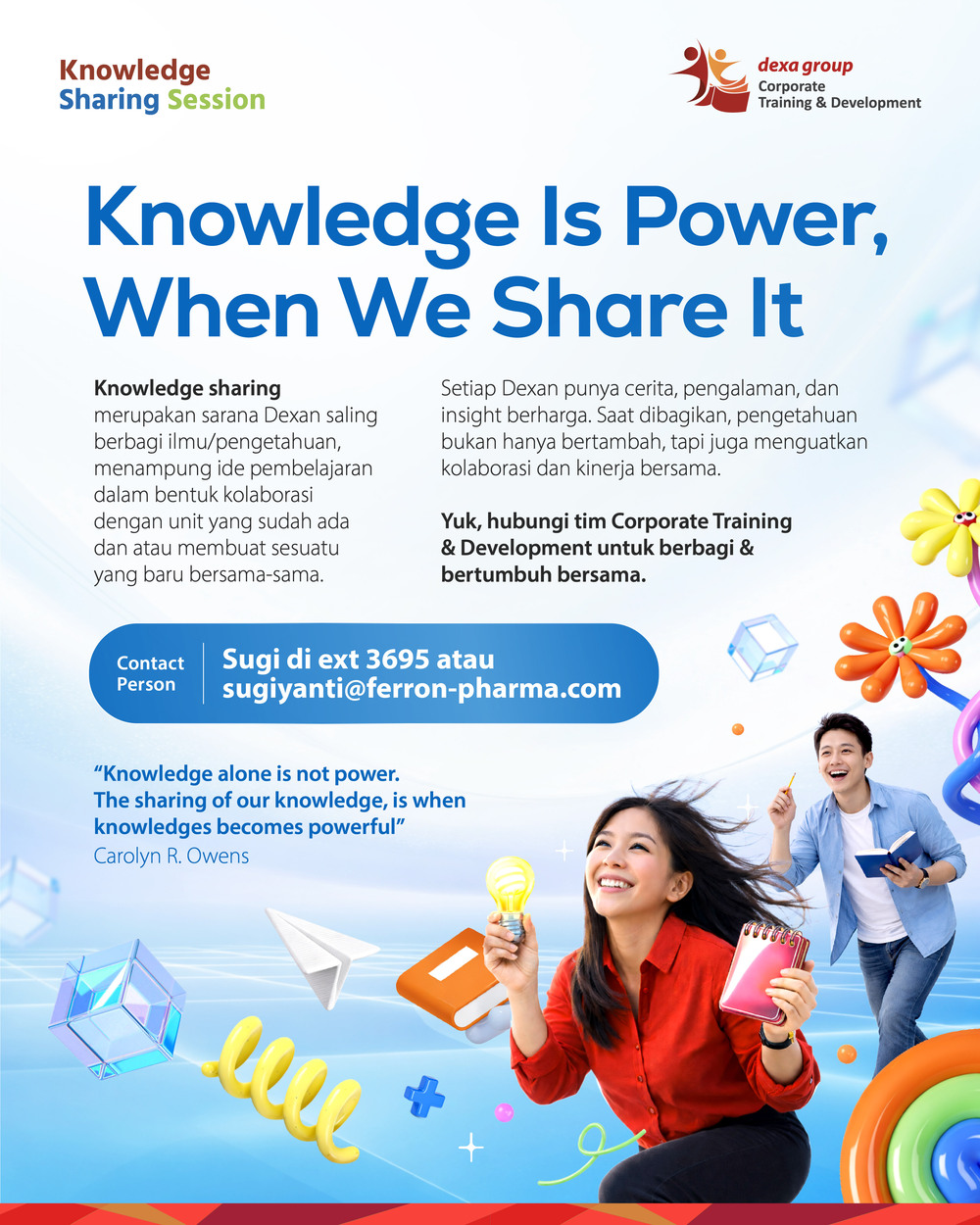 Setiap Dexan punya cerita, pengalaman, dan insight berharga. Saat dibagikan, pengetahuan bukan hanya bertambah, tapi juga menguatkan kolaborasi dan kinerja bersama.